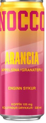 Nocco Arancia inniheldur 105mg af koffíni per dós. Appelsínu- og granateplabragð.